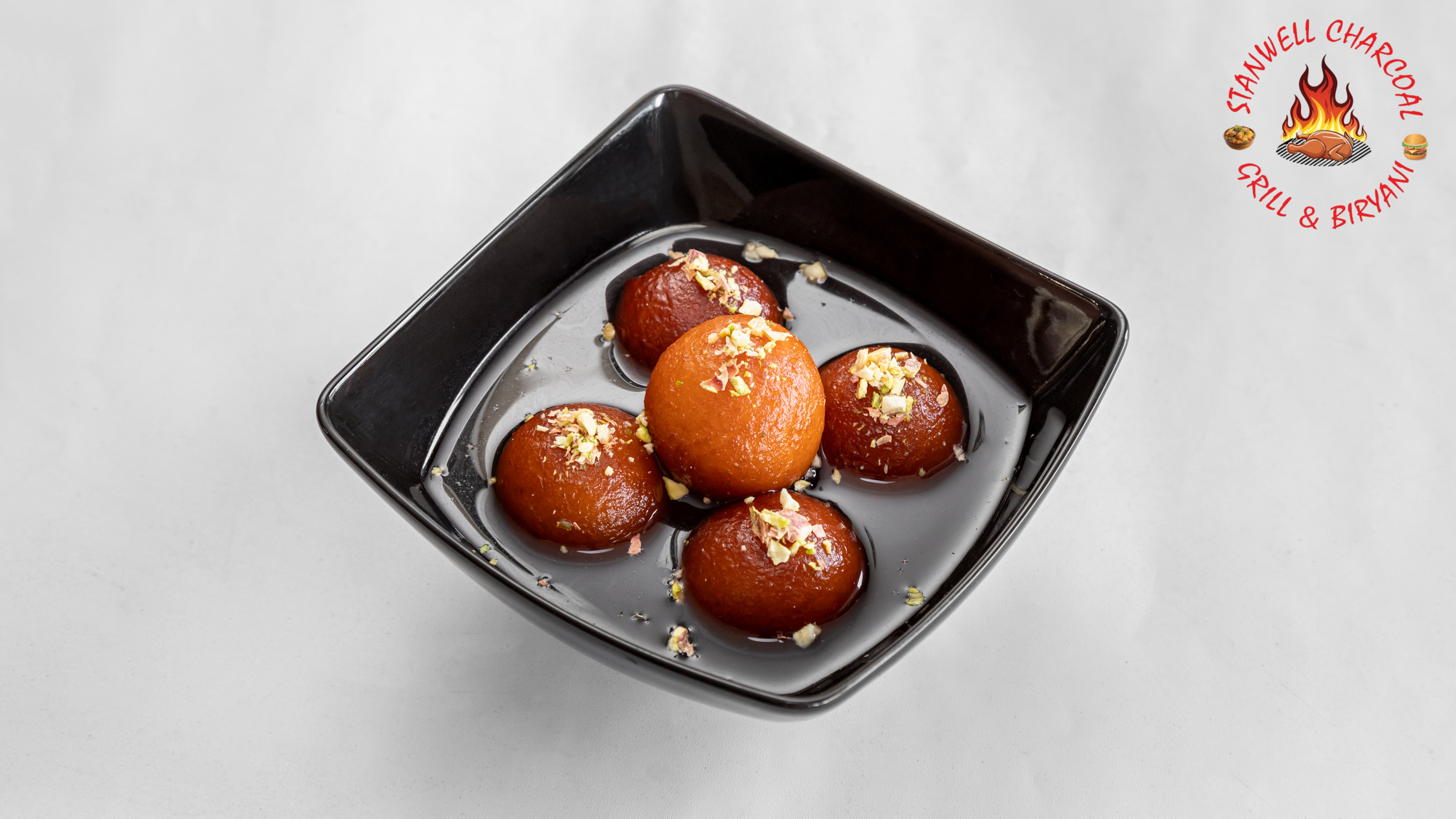 An Indian dessert of fried dough balls that are soaked in a sweet, sticky sugar syrup