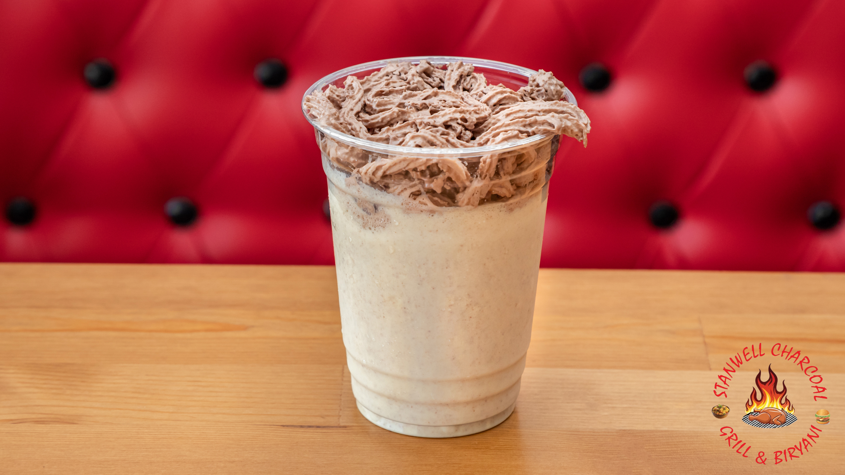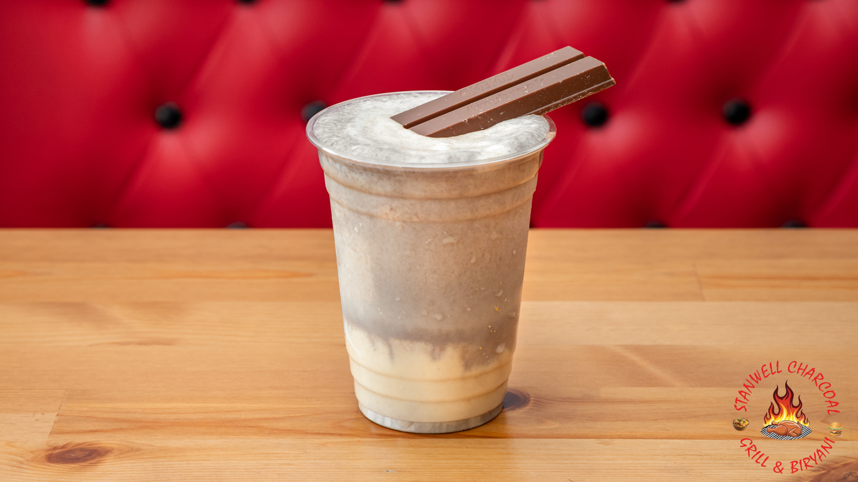 Decadent milkshake made with kit-kat, blended with creamy ice cream and topped with whipped cream and kit-kat pieces.